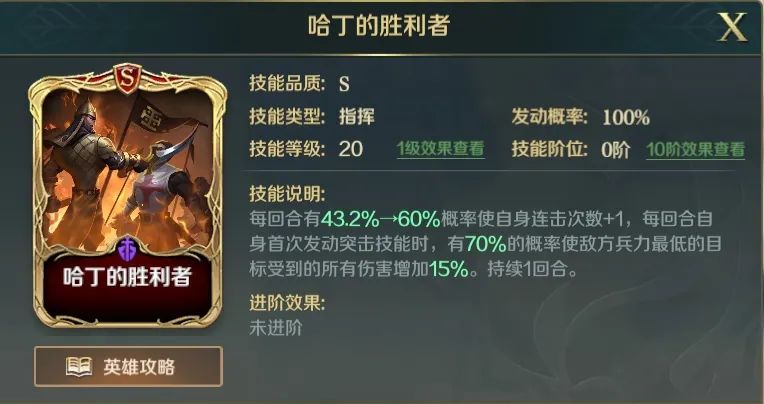 该技能适配S2比较流行的爆头队:腓特烈、萨拉丁-雅法奇袭、铁木真。注意,该技能最好搭配【楔型骑兵阵】一起使用,这样才能保证将有异心状态的敌人快速重伤,从而回血。