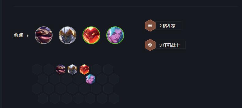 2费赌狗必打5连败开局,前期只拿阵容需要的体系卡,如永恩、剑魔、女坦、慎,小羁绊只做2狂战、2护卫或是2格斗,装备不要给,2星多的话可以演一手,挂相同英雄不凑羁绊,或是空余人口,能吃利息的话可以卖多余英雄。2阶段确保连败不断,到3-1吃6连败,在3-2拉6人口,经济不会低于50,此时前期的运营目标就达到了。