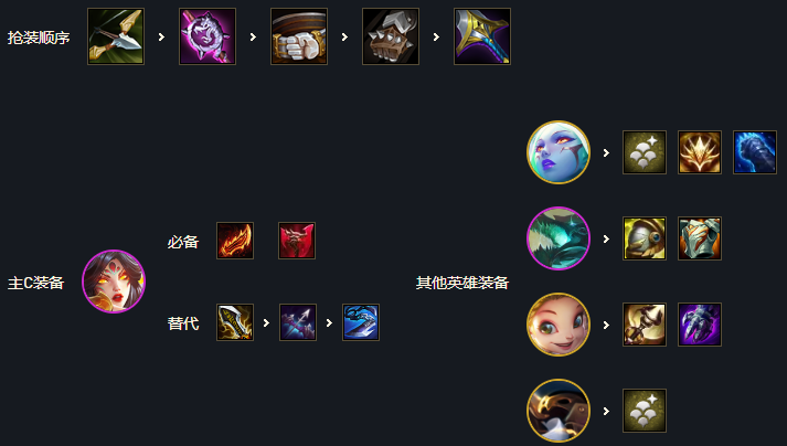 群英冠冕建议给巴德或者索拉卡,搭配钻石之手可以触发好几次真实伤害。给长手站后排输出最大化,越晚下霞越好因为带羊刀攻速快可以打更多的经济来保证追三星五费或者八费甚至十费卡,前排艾达丝带狂徒反甲龙牙大亨之铠或者钻石之手越肉越好。其他挂件就不配带装备了,建议准备一个凌风和射线,因为阵容到打后期的伤害跟坦度都不足所以用来拖时间触发群英冠冕。