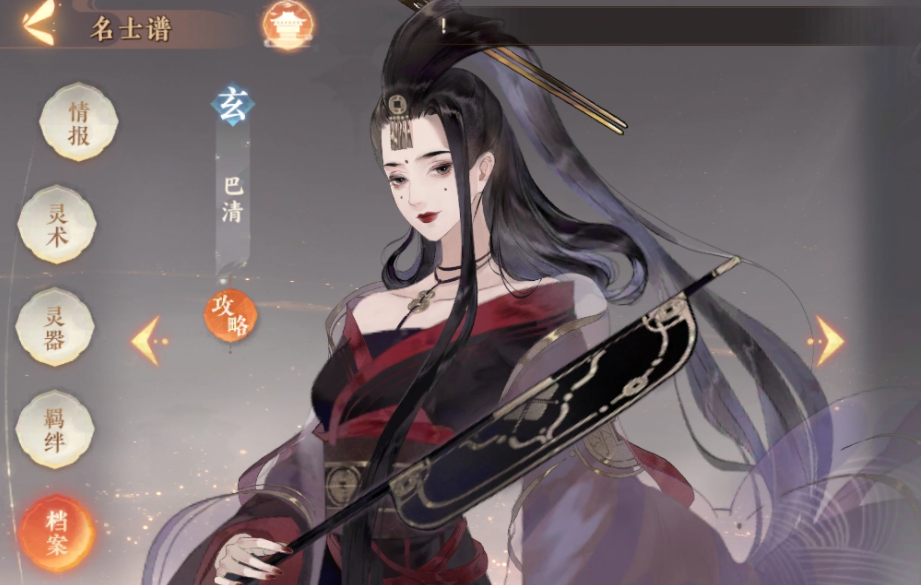 系统推荐“茂和”(减疗)和“驭衡”(眩晕),巴清所有技能为群体伤害,可以轻松给敌方挂上Debuff;若与范蠡和袁天罡搭配,可以使用“灼华”(增元)快速且频繁的释放觉醒。