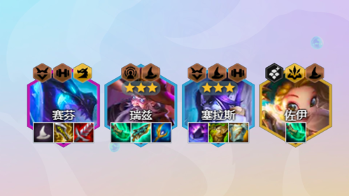 后期阵容:5-1回合升8人口,大搜一波,搜两星赛芬的同时搜三星瑞兹,佐伊可以换娜美,后期C位都神装的情况下可以给巴德和佐伊找装备,这两个怪都需要朔极之矛,后期不用升9,全部金币用来追三星萨拉斯和瑞兹,赛芬来得多有妮蔻之助也可以追三星。