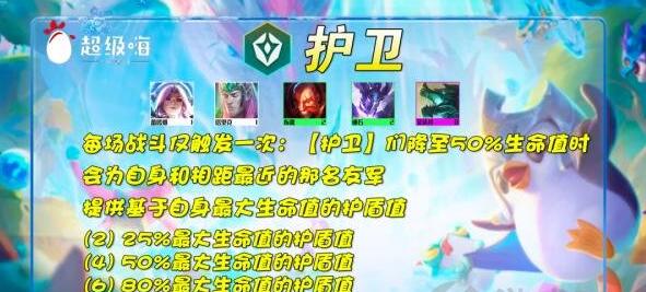 1、首先赌EZ阵容核心是护卫羁绊,高护卫就意味着高护盾,护卫羁绊越多提供的生命值百分比越高。