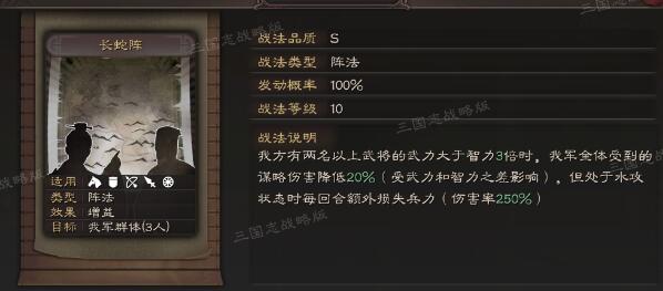 长蛇阵最好的搭配是和藤甲兵同队,组成双抗阵容,如果单个长蛇阵遇到纯兵刃队相当于“让”个战法,比如蜀枪遇到虎臣弓,就像藤甲兵碰到五谋臣兵刃减伤相当于没起作用。