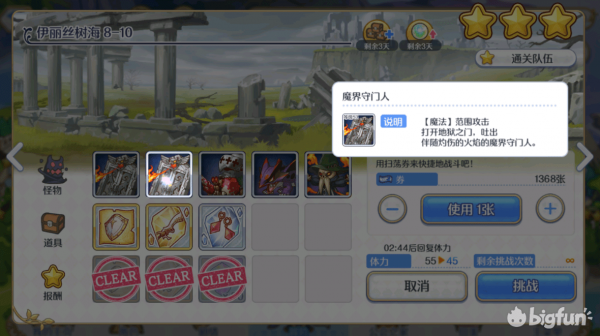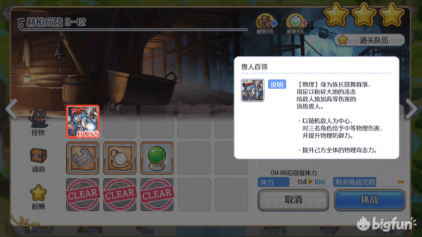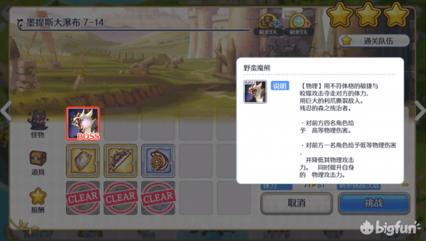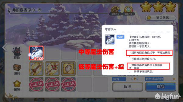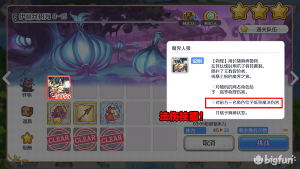 物理大BOSS赋予了法伤技能,虽然说的是低等魔法伤害,还是轻轻松松打上千伤害,太怕痛,建议继续带黄骑。首先开荒2-3次熟悉一下BOSS释放技能的时机,所谓观察抬手动作,预判实际,然后卡在BOSS技能释放前,提前开启黄骑的魔免盾。同时本关最好有一个3星输出角色,比如单体暴击弓,能对BOSS造成提成顿伤害。(另外不知道是我错觉,还是本关有个小BUG,明明我方队员还在跑图,BOSS就先手给我前排来了一巴掌=。=?)
