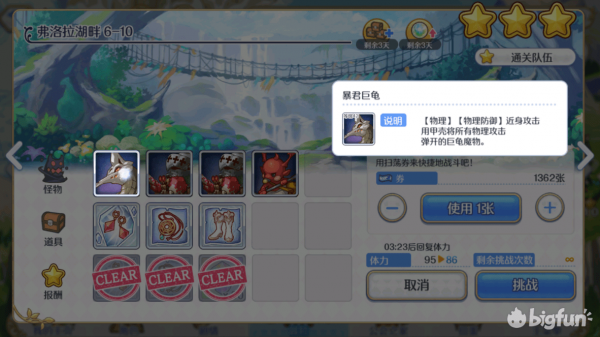 专注发育三十年,终于不甘只做大炮车想翻身做ADC的野怪出山了(求求你做个人吧),本关是纯物理队,在前排胯下疯狂输出的大炮车有点恶心。攻击频率快伤害又高,一会就可以磨掉我们的前排。这个时候控制更加重要了,羊驼和胡桃至少上一个,或者建议双奶,上单核输出逐一击破。