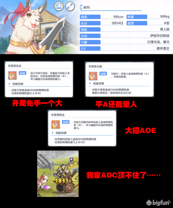 这个1星卡真是强的离谱,开局就先手一个大进场,绝对一号位扛伤,平A还能晕人,接着大招还是群伤,自身防御越打越高,如果是竞技游戏,这羊肯定马上挨削!而且升2星后的羊驼有不输给同星布丁的面板实力,羊驼兼并PVE和PVP!众所周知,控制才是打团的关键!