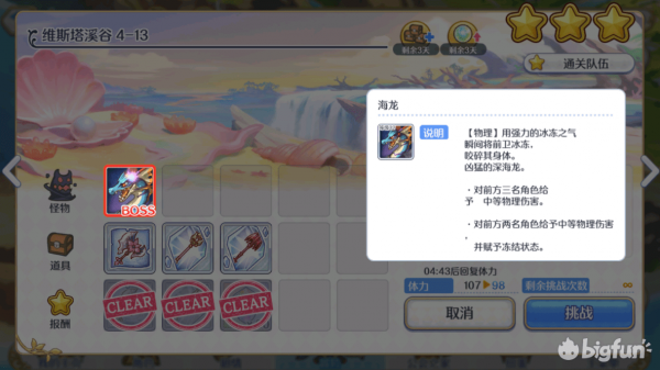 这个是我们第一次可能要用到手动控制技能的时候,何时加血,何时开大,需要看时机了。BOSS有成顿输出且技能带毒,如果你的奶是主动加血的优衣和千歌的话,手动操作加血,即可防止暴毙。输出英雄可以同时集火开大,争取二轮集火结束战斗。