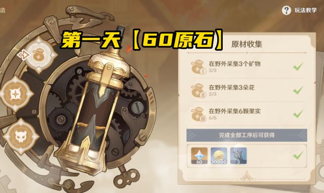 第一步难度很小,因为稻妻有很多场景【名椎滩、九条阵屋】附近都是有矿物(紫晶矿)、花(甜甜花)和果实(树莓)同时出现的场景,采集完成后需要把所有收集到的材料加入到【大工机】中,之后可以在【剧情制作】中直接领取60原石和摩拉等奖励。第一天的活动内容就结束了,是不是感觉很简单呢?没错,炉心机造中的NPC伯特兰又被玩家称作Small“立本”,同样的甜甜花换原石的场景又再次出现了。