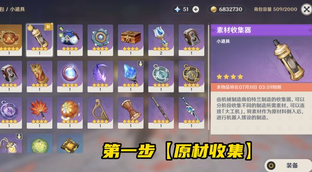 紧接着我们来看一下活动的具体玩法,首先玩家需要完成【剧情制造】这部分,然后才可以解锁【自由制造】,不过不论是哪种制作方式,都分为三步,第一步【原材收集】,与稻妻的【四平八方之网】很相似,玩家需要装备【素材收集器】,采集3个矿物、3朵花和6颗果实,注意是有顺序的,先得采集矿物,才能采集花,最后才是果实,而采集的完成度可以通过采集收集齐的百分比进度查看。