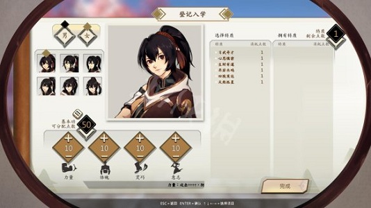 开始游戏进入角色创建界面,玩家可以选定主角的性别以及外貌。下方的50个属性点玩家可以手动调整或者通过掷骰子随机分配。