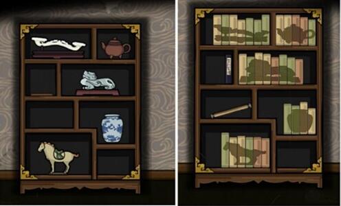 2、然后点击上图右边书柜拼好柜中5样物品,再根据右边柜子的图案对应左边的柜子中的实物。