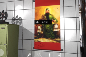 关二爷这个线索位于冰箱和后厨中间的瓷砖墙上挂着。