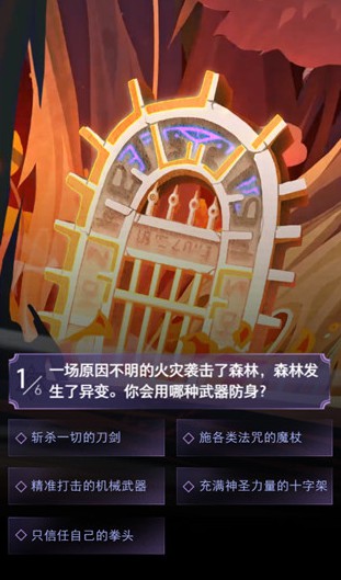 测试内容:通过选择武器、突发情况应对、处世态度和原则、人生感悟等问题,剖析玩家的性格特征
