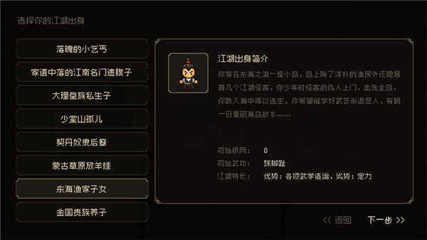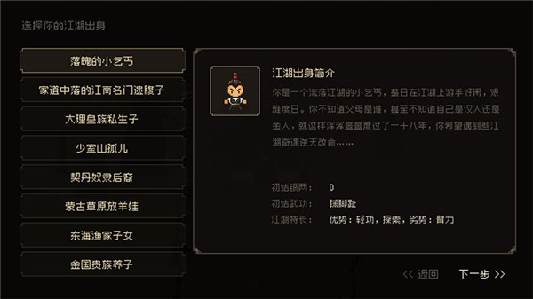 1、不同出身选择,带来的初始金钱、初始武功和江湖特长是不同的。