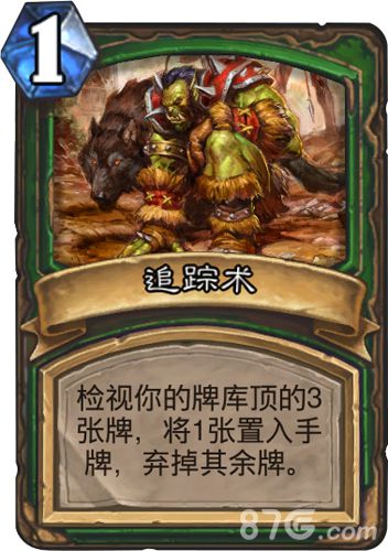 的追踪术是猎人的免费法术牌,卡牌效果是检视你牌组上的前3张卡牌,获得1张并丢弃其他2张,花费为1。很多玩家在拿到这张卡之后,总是忍不住用掉,其实这是不对的。这张卡的用处在于,当你陷入险境,或者对方和你一同低血量的时候,你可以有更高的机会获得逆转的卡牌。