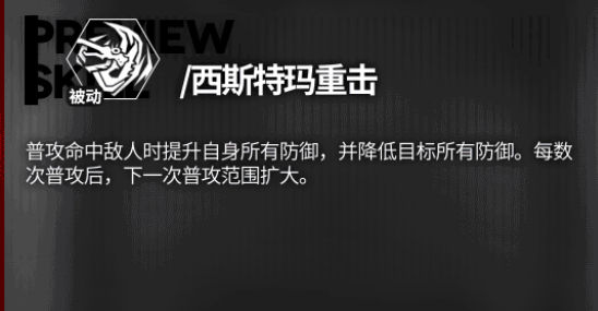 普攻命中敌人时提升自身所有防御,并降低目标所有防御。