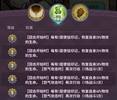 福音布道:3次攻击,然后叠加使徒印记,配合怒气武器直接满怒