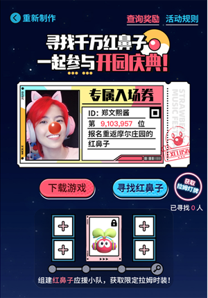3、然后就可以生成专属入场券一张,点击寻找红鼻子可得到入场券海报,