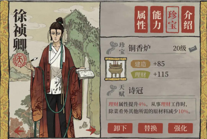 江南百景图铜香炉天赋是诗冠,理财属性提升4%。理财属性提升4%,从事理财工作时,除菜肴外其他所需的原材料减少10%。接下来小编带来具体的介绍。