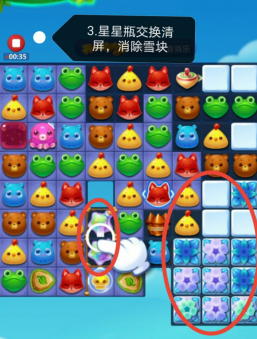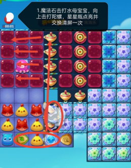 1、三消激活魔法石,击打水母宝宝向上打陀螺,星星瓶点亮立即交换清屏一次