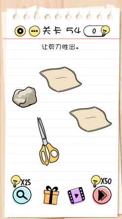 Brain Test第54关怎么过?第54关的题目是:让剪刀胜出。其实这一道题目很简单,玩家需要将石头往布上拖动,再使用剪刀往布上拖动即可。下面小编就为大家带来了通关攻略!