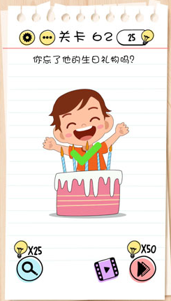 Brain Test第62关怎么过?第62关的题目是:你忘了他的生日礼物吗?其实这一道题目很简单,玩家需要将下方的礼物盒给他,屏幕中只有这一个礼物按钮才可以当做礼物送给小孩子。下面小编就为大家带来了通关攻略!
