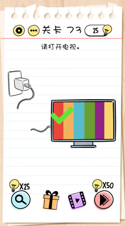 Brain Test第73关怎么过?第73关的题目是:请打开电视。其实这一道题目很简单,玩家需要同时两个手操作按住断掉的电线,就可以打开电视。下面小编就为大家带来了通关攻略!