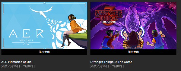Epic下周可免费领取的游戏已经出来,分别为美剧改编的经典作品《怪奇物语 第三季》和奇幻的探索冒险类游戏《AER:古老记忆》,领取时间为2020年6月25日至7月2日,玩家在Epic商城就能领取。