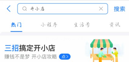 1、首先我们是可以打开支付宝,打开之后就可以在首页最上方点击搜索【开小店】;