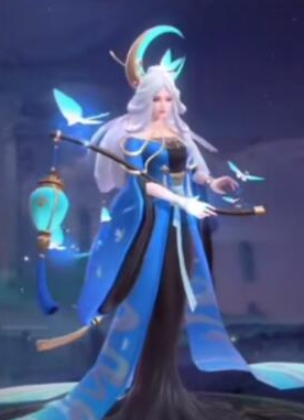 3、从图片来看,这款皮肤比白蛇的皮肤改进了不少,整体上以蓝色为主调,古风满满,拎着蓝色的灯笼,标志着大乔的象征。