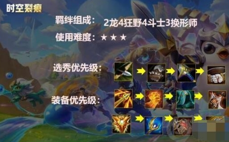 2-1升4人口,前期使用逆鳞战姬(龙女),未来守护者(杰斯)西斗之飒(豹子)南天之怒(狼人)凑出3换形2狂野,装备直接合了,基于分裂弓龙女连胜。