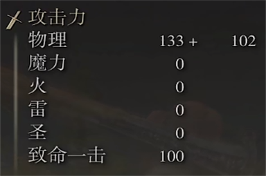 从石像鬼大剑的属性面板中可以看见它有着133点的物理攻击,伤害是很足的,但是由于这个武器较重,所以对于力气的需求也是蛮高的。