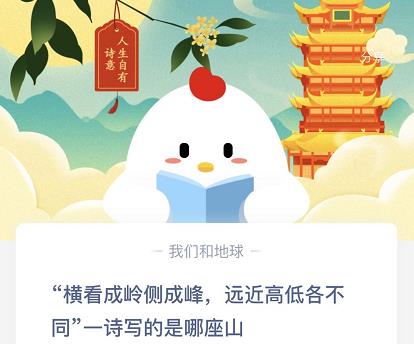支付宝蚂蚁庄园小课堂11月4日的第一个问题是:“横看成岭侧成峰,远近高低各不同”一诗写的是那座山?这个考察大家文学常识,下面小编就为大家带来蚂蚁庄园今日答案,一起来看下正确回答吧。