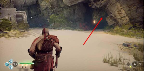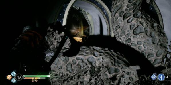 从索穆尔的尸体的辛德里商店出发,接着来到上层遇到一个荒原浪人,击杀他后,拉动场景中的石块一次,再用斧子击打上空悬挂的断剑,如此就可以爬到上方的平台,打开宝箱。