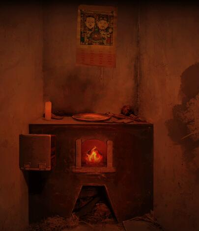 10、然后我们点燃稻草以及篾条放进灶台,火烧起来后,点击火字纸片,将纸放火上烤,上面有字,意思是煮一锅红骨汤。