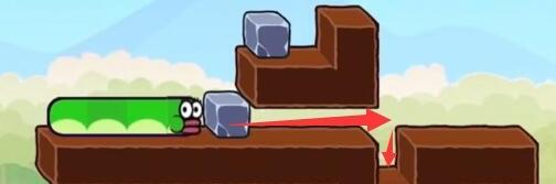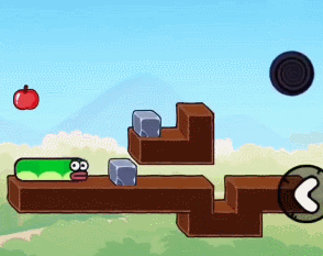1、首先我们第一步要做的事就是把如图所示的下面这一块石头推到苹果的下面,这样我们就可以在石头上吃苹果了。