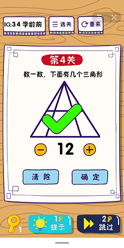 在第4关中,数一数,下面有几个三角形,考验你数学的时候到了。下面小编就给玩家带来这题太难了第4关怎么过的攻略,一起去看看吧!