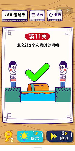 在第11关中,两个人都想过河,且要同时过河,但是船太小承载不起两个人的重量,这该怎么办呢?下面小编就给玩家带来这题太难了第11关怎么过的攻略,一起去看看吧!