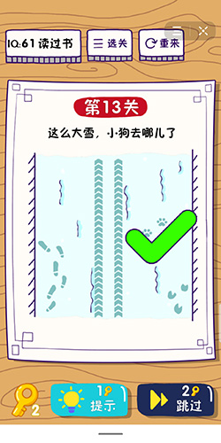在第13关中,这么大雪,小狗去哪儿了呢?我们要赶紧找到它,免得被冻坏了。下面小编就给玩家带来这题太难了第13关怎么过的攻略,一起去看看吧!