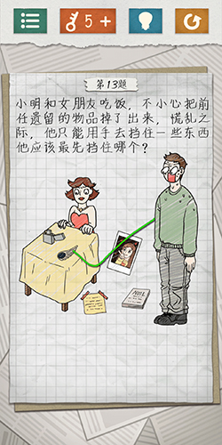 在第13关中,小明和女朋友吃饭,不小心把前任遗留的物品掉了出来,慌乱之际,他只能用手去挡住一些东西,他应该最先挡住哪个?下面小编就给玩家带来最囧游戏4第13关怎么过的攻略,一起去看看吧!