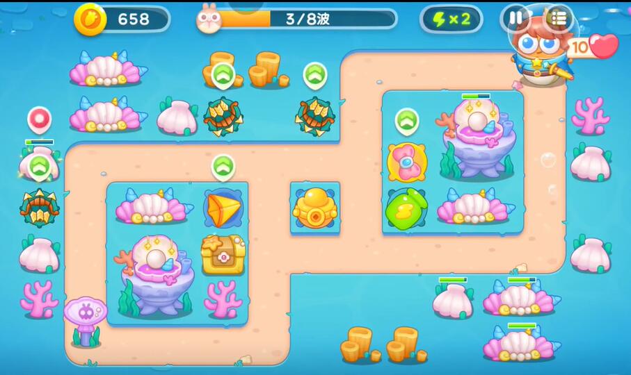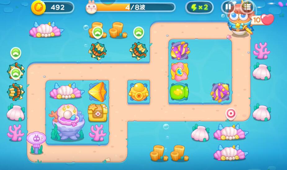 1、在左侧和中间偏左上侧的位置建造一个多重箭塔,左侧的清怪,中间的搭配上建造的一个纸飞机对上方的障碍物进行攻击。