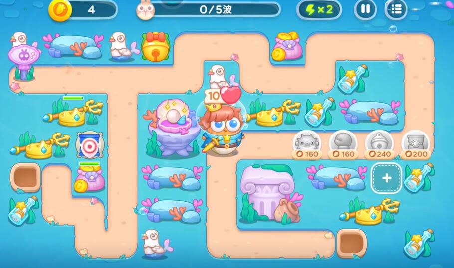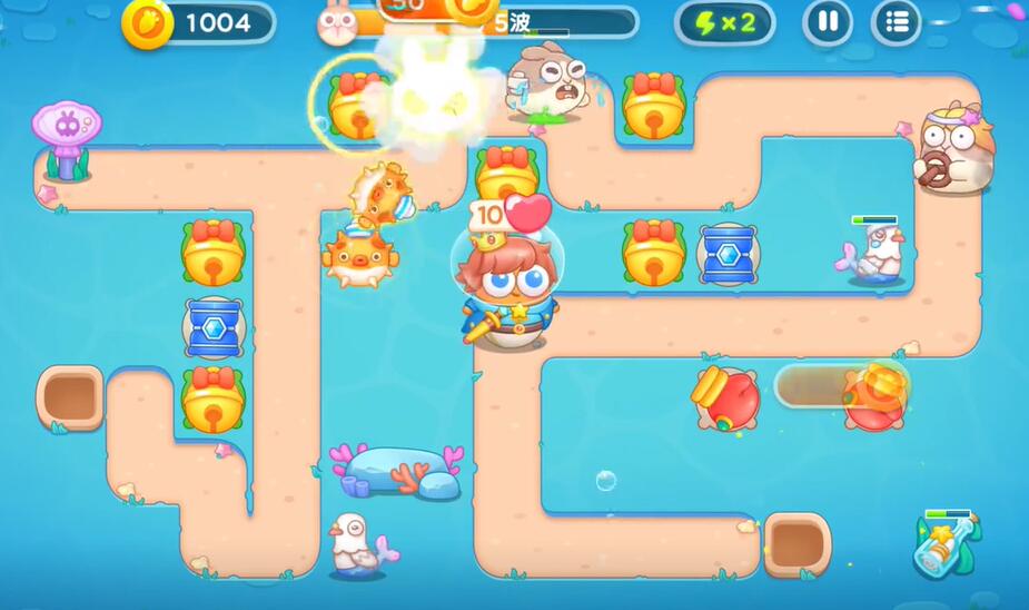 1、升级关卡中提供的铃铛清理兔子,在左侧的中间建造一个双向塔清理障碍物。