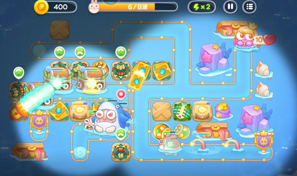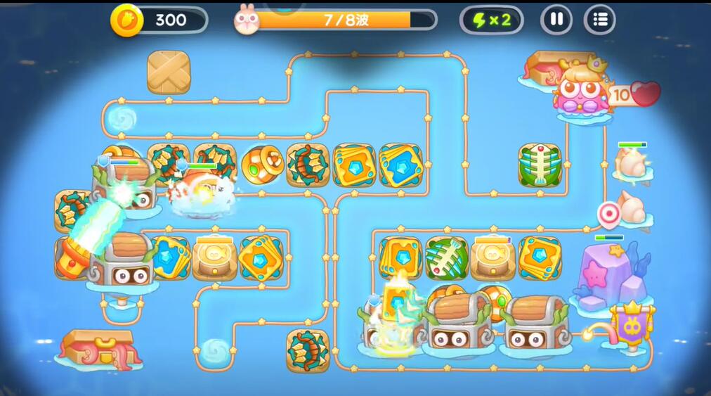 5、在中间的偏左侧补充一个鱼雷塔,中间补充一个卡牌塔,右下角建造鱼骨塔,对右侧的兔子进行攻击。