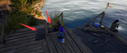 2、随后往下放走,可以看到一个钓鱼的,在钓鱼佬的背后就可以看到两个垃圾袋,玩家需要将这两个垃圾袋带回去。