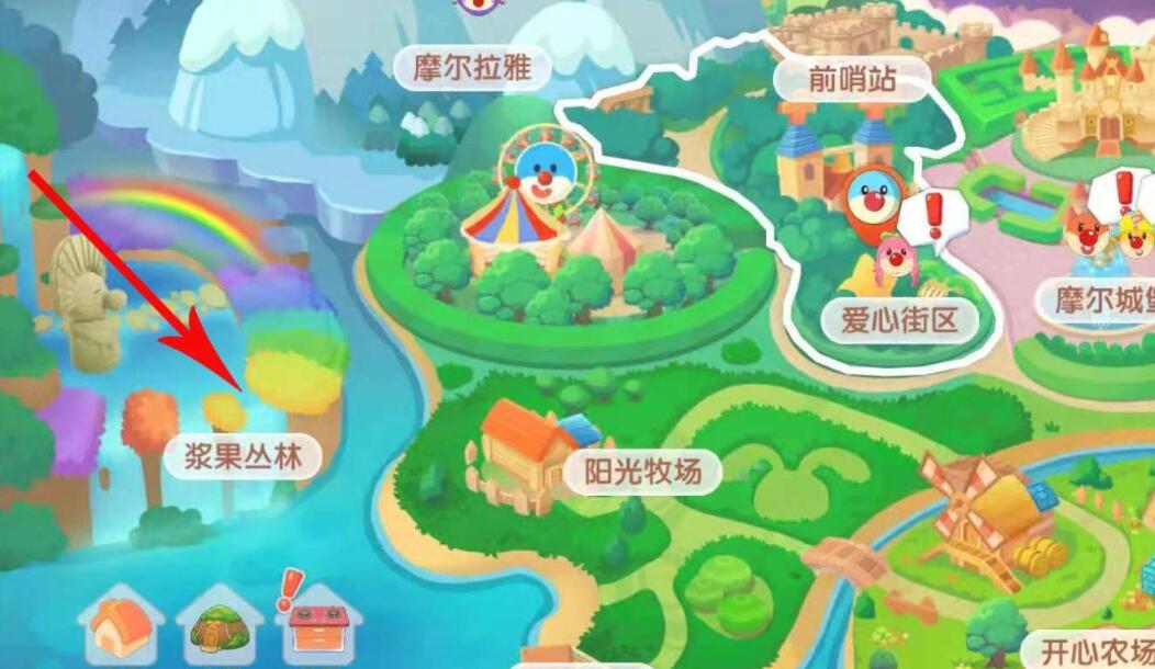 1、首先打开摩尔庄园的地图,然后点击浆果丛林,进入;