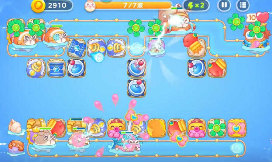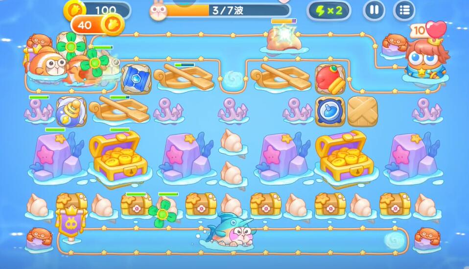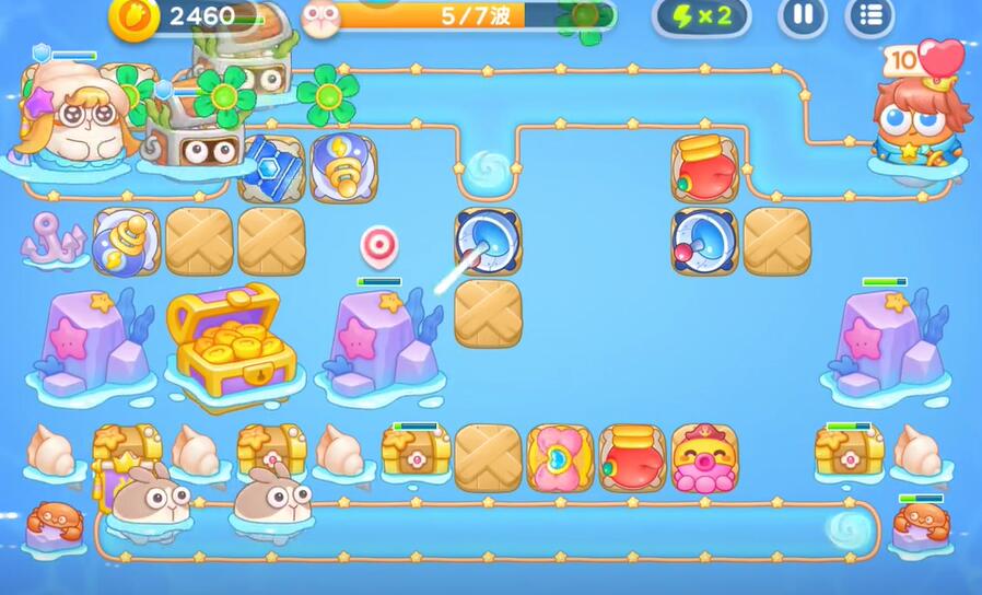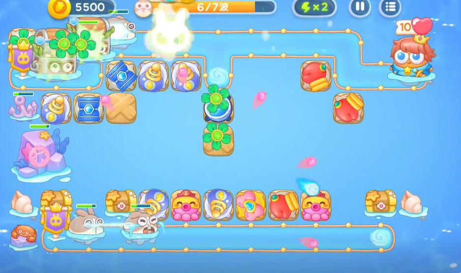 5、通过摧毁宝箱可以获得蝴蝶结和章鱼,利用这两个塔对障碍物进行输出。