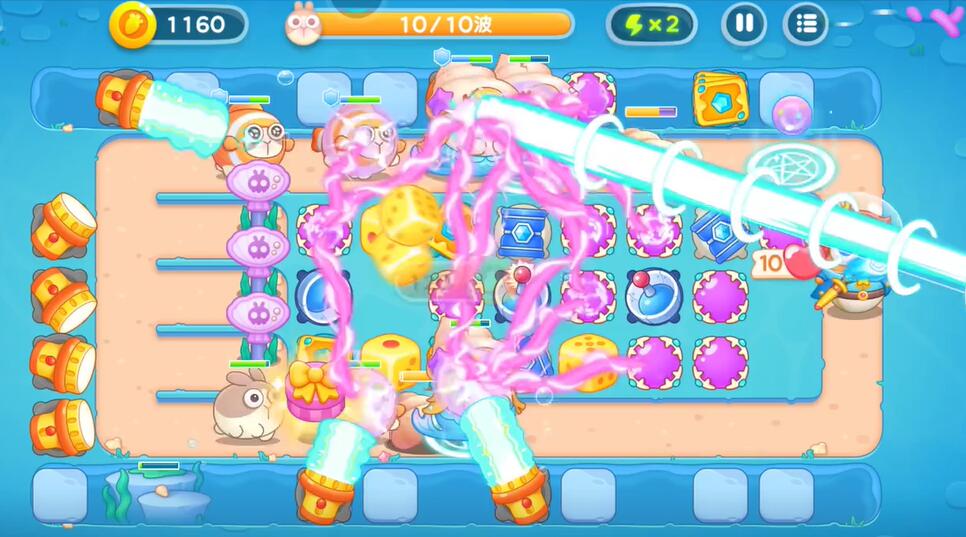 5、在中间的最上方的一排建造魔法球和双向塔对兔子进行输出,下方建造手电筒清理水中的障碍物和兔子。