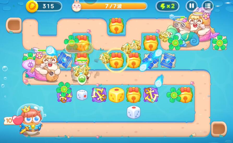 6、在最底下的一排建造骰子塔来更好的进行攻击,在上方补充铃铛对兔子进行攻击。