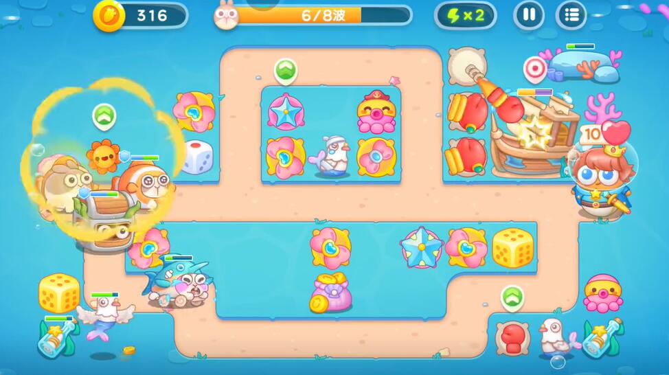 4、在左侧和右下角各建造一个骰子,对障碍物进行输出,同时在中间偏右上的位置建造一个章鱼攻击兔子。