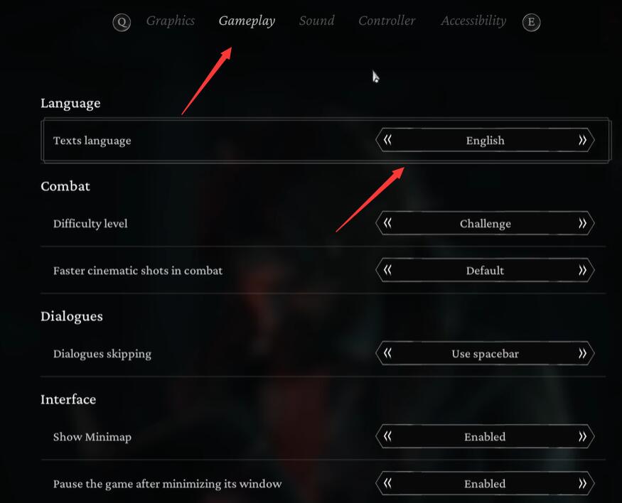 3、在这里找到【Gameplay】,在这个选项里有一个【Language】。